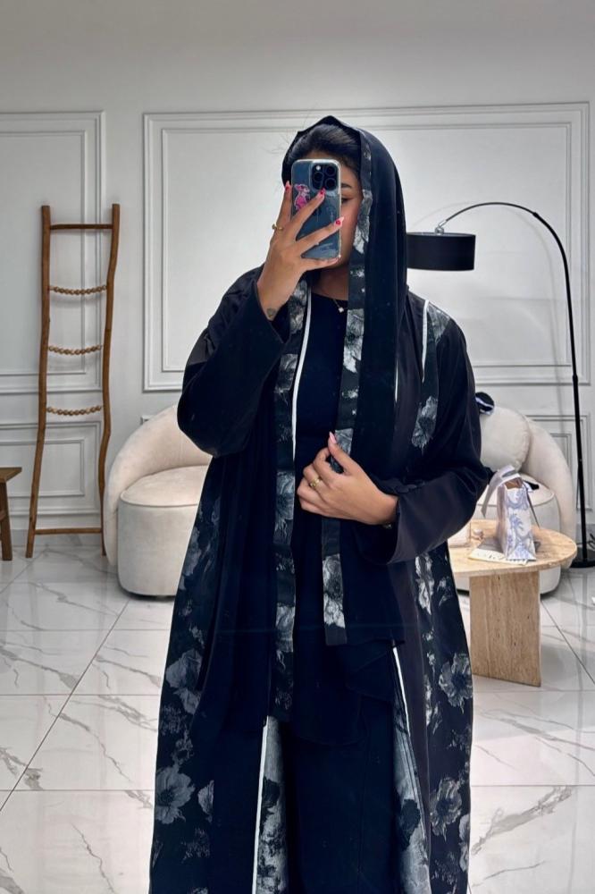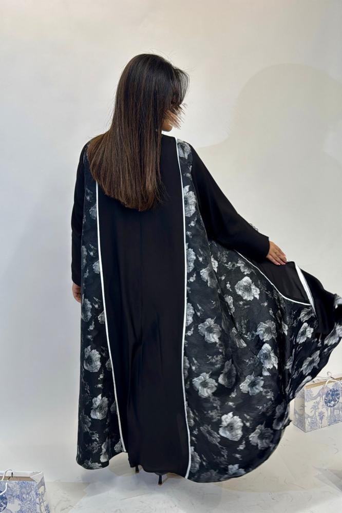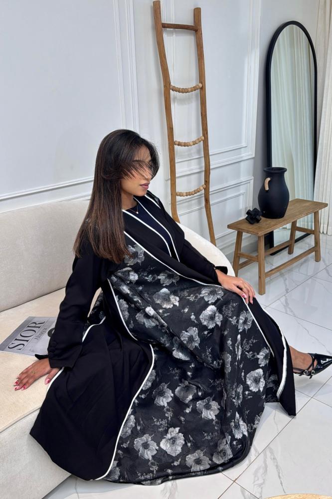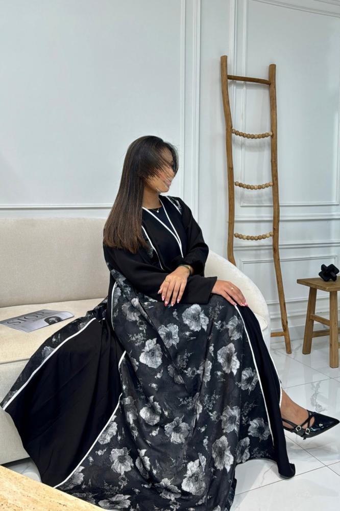 عبايات ابيض فى اسود بتصميم مفتوح وقصة نص كلوش، مصنوعة من قماش كتان فاخر في الأمام مع جوانب وأكمام من قماش ورقتز هندي مشجر مطرز بالورود، لتمنحك إطلالة فاخرة تجمع بين الأصالة واللمسة العصرية.
